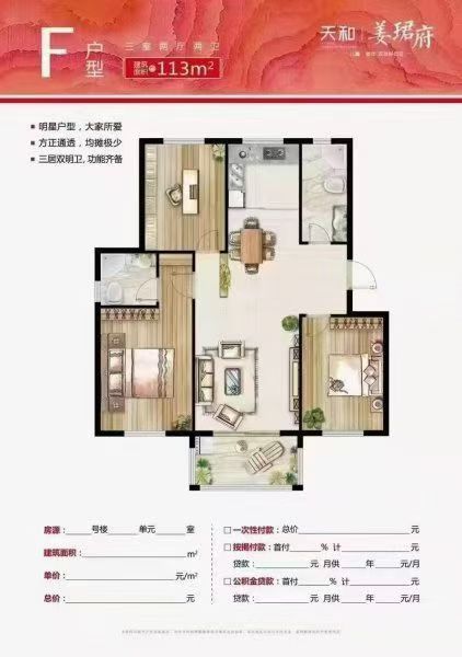 三室两厅两卫,毛坯,元宝户型,