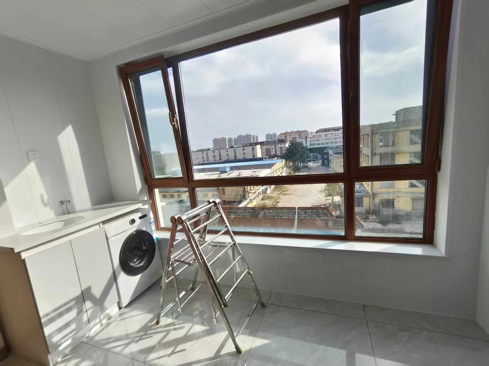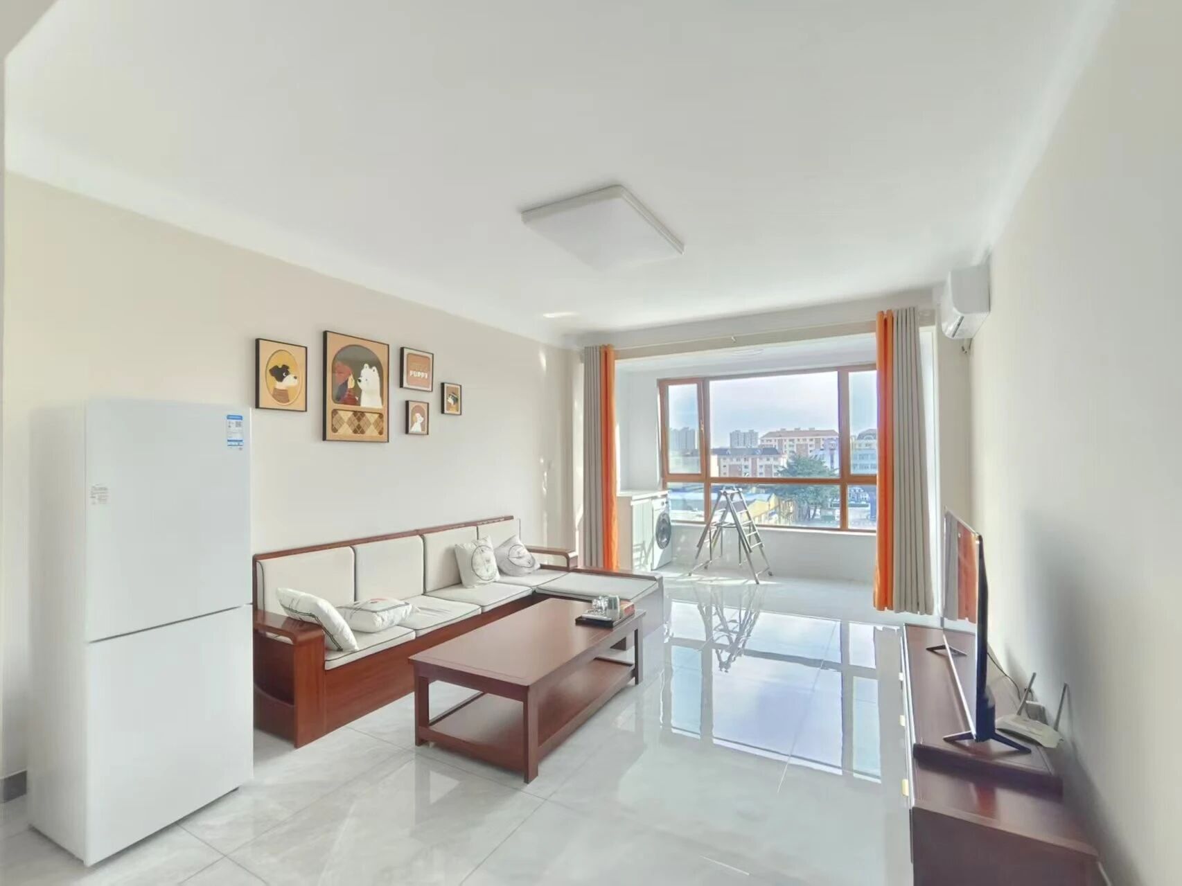 南厅,南北各一卧室,客厅立式空调,电视、冰箱、太阳能、新买的可烘干洗衣机,房屋干净整洁,家