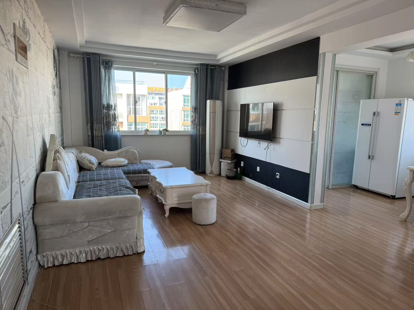 于家小区平地起四楼(共5层)95平经典三室,简装家具家电齐全,拎包入住,水、电.暖气、天然气都