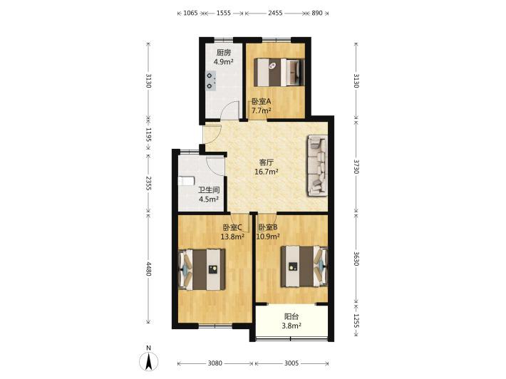 新庄家家悦路南得润东区2楼84平三居室中间客厅南向两个卧室主卧有阳台北向厨房、餐厅,