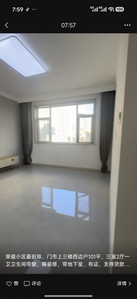 荣盛小区**前排,门市上三楼西边户101平,三室2厅一卫卫生间带窗,精装修,带地下室,有证,支持贷款!45万