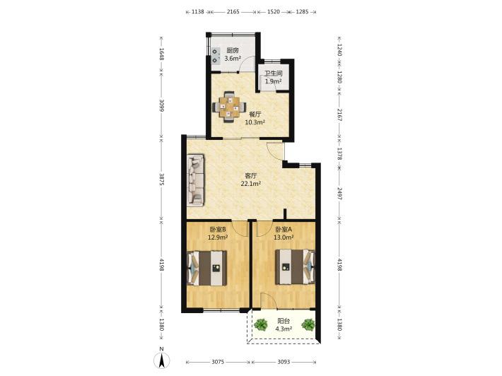 户型;两室朝阳北厨北卫北厅